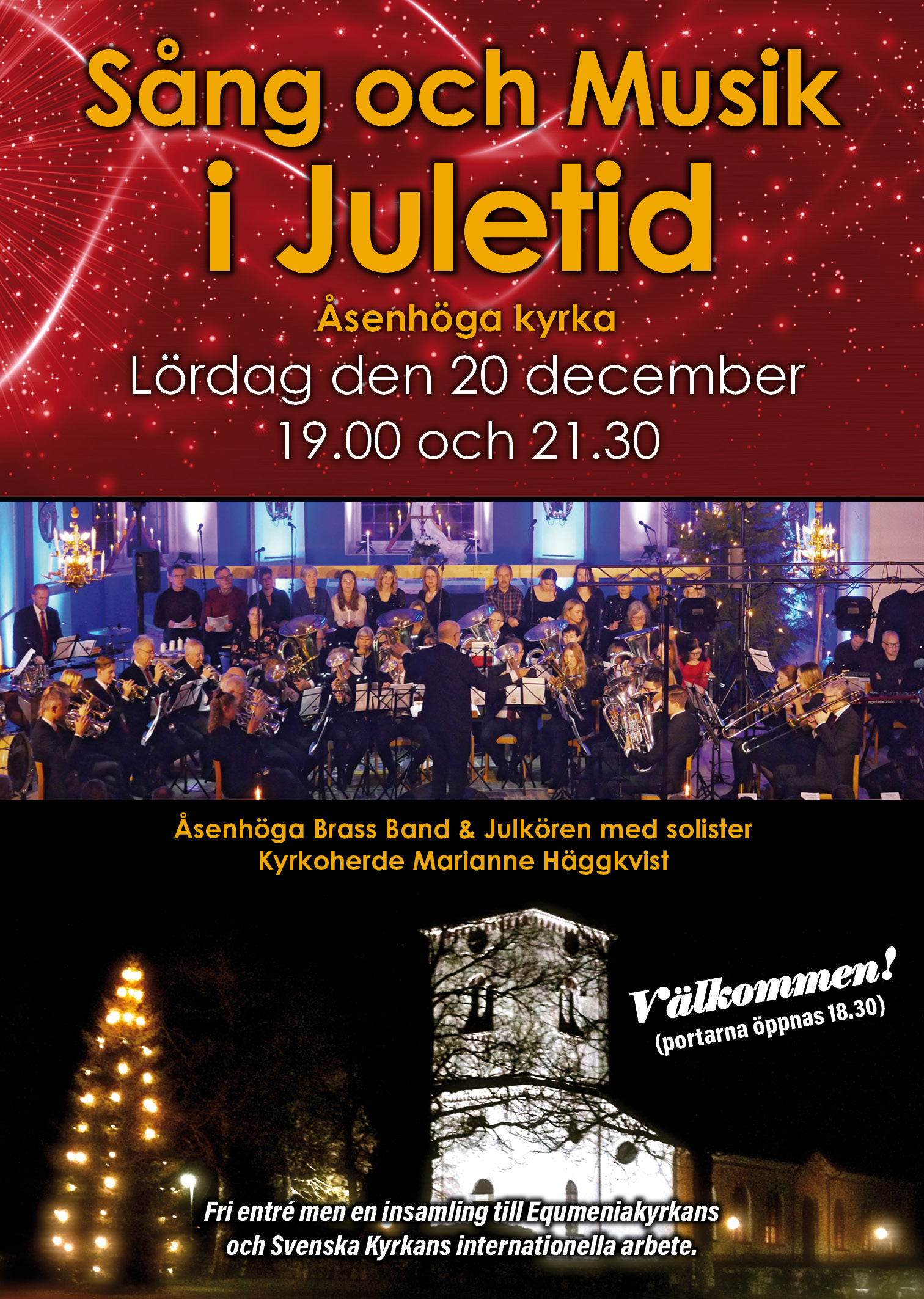 Välkommen på traditionella julkonserter i Åsenhöga kyrka lördagen den 20 december kl. 19.00 och 21.30. Åsenhöga Brassband och Julkören med solister bjuder på en stämningsfull kväll inför julen.